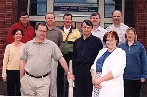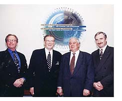 creation by May, 1999 marked the official opening of the new Abbotsford Transport Canada Centre. Officiating were Transport Canada's Regional Director Mark Duncan (right) and (from left) , David Nowzek, Regional Director Civil Aviation, Jerry Lloyd, President BC Aviation Council and George Ferguson, Mayor of Abbots ford. The centre's new logo in background.