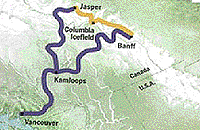 Railtours route to Alberta from Vancouver, BC on the Pacific