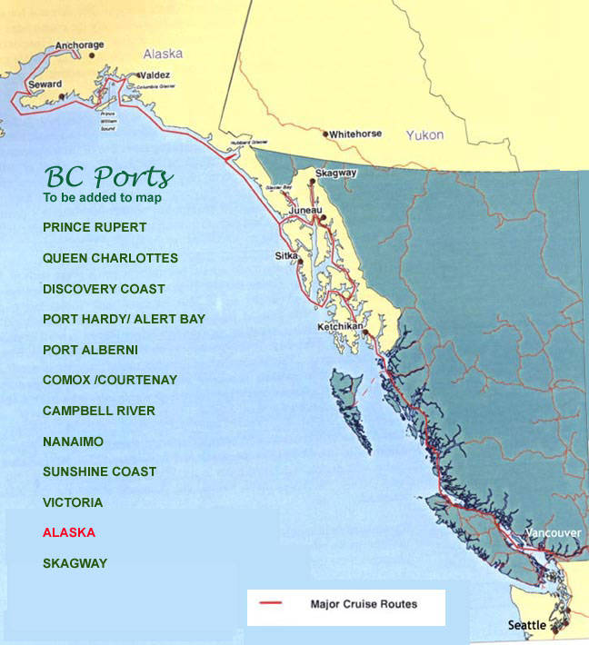 Interactive Map of BC-Alaska Cruise Routes: Click on any location for a profile. Scroll for more links